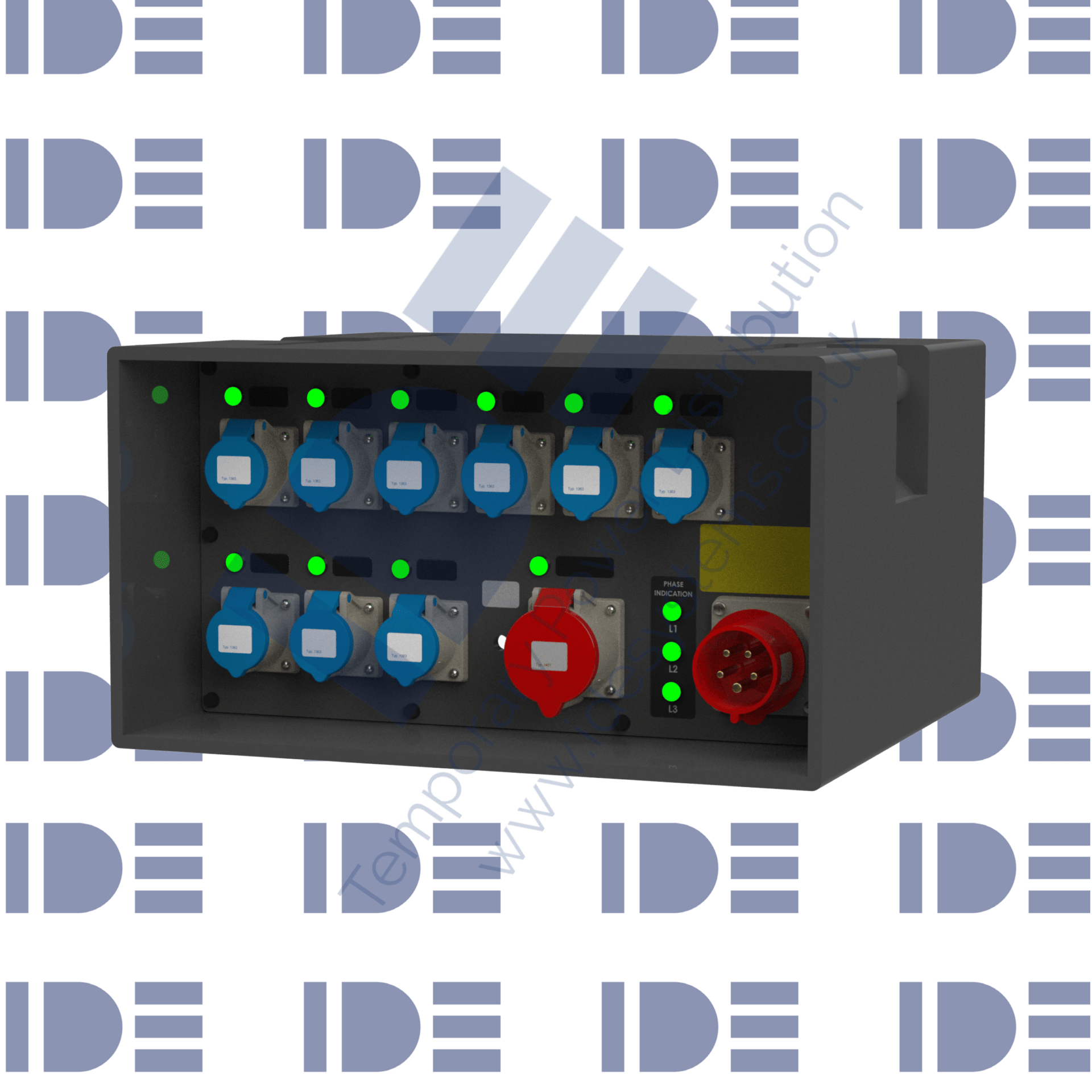 A 32A three-phase (400V) event power distribution box designed to distribute temporary power from one area to another. The 32A plug and play distribution board is easy to relocate across site and blends in well with the surrounding environment.