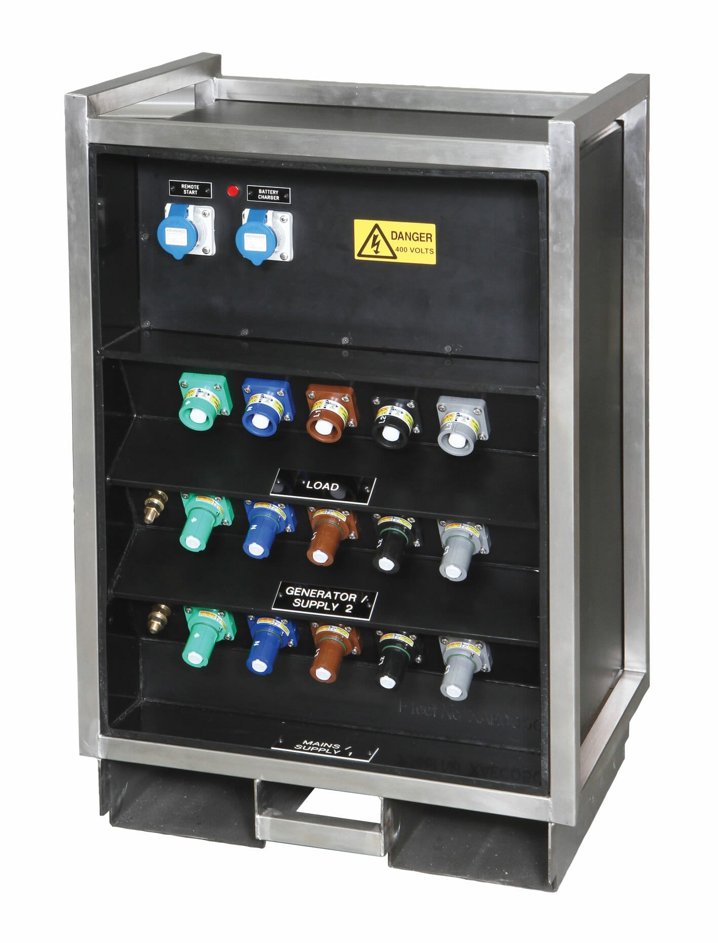 Supply availability neon’s for visual representation of status. Incoming supply adjustable undervolt and time delay relays for setting of individual supply parameters. All Equipment housed in a polyethylene enclosure, with recessed Socket and Switchgear panels for mechanical protection. External brass earth studs. Complete unit mounted within a stainless steel crash frame with forklift pockets.