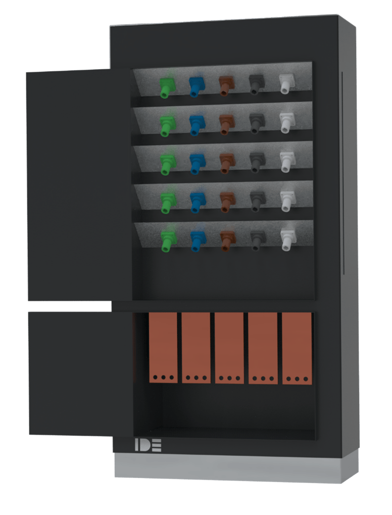 Dark Grey (RAL7021) textured powder coated stainless steel construction (1.4003 grade). Other colour options maybe available by request. Powerlocks mounted on a 45 degree angle aluminum plate. 3mm aluminum top and bottom gland plates are provided. Assembled to IP54.